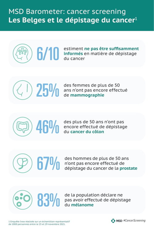 La population belge est mal informée en matière de prévention du cancer. En effet, près de 6 Belges sur 10 estiment ne pas être suffisamment informés sur le dépistage du cancer. Ce résultat est démontré par une enquête récente menée par iVOX auprès de la population, validée par des oncologues belges et avec le soutien de MSD Belgique. L'enquête portait à la fois sur le dépistage du cancer et sur les habitudes saines permettant de le prévenir. Un constat alarmant lorsque l’on sait que la prévention du cancer est une arme très importante dans la lutte contre cette maladie dévastatrice.