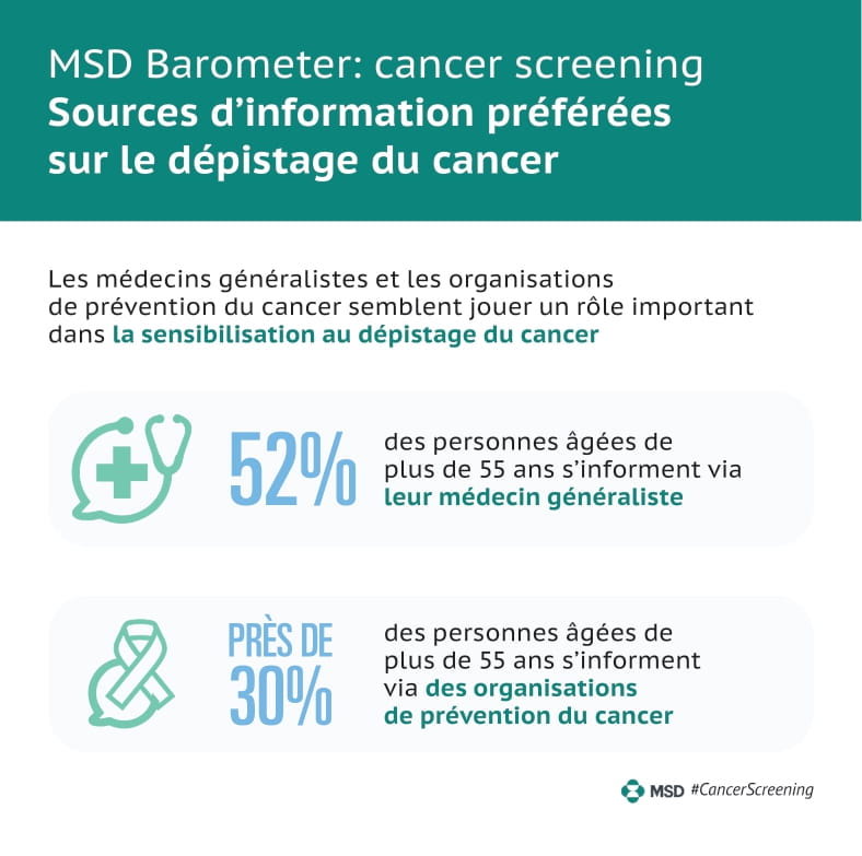 Les médecins généralistes et les organisations de prévention du cancer semblent jouer un rôle important dans la sensibilisation au dépistage du cancer. En effet, les personnes interrogées dans le cadre de l'enquête indiquent qu'elles sont la source d'information la plus fiable et la plus privilégiée. Elle soulève la question de savoir si les médecins généralistes devraient être plus activement et plus étroitement impliqués dans le dépistage du cancer. La prise en charge de cette responsabilité aujourd'hui est encore trop informelle et varie fortement d'un médecin à l'autre. Cela peut expliquer pourquoi une partie du groupe cible du dépistage du cancer ne se sent pas concernée.